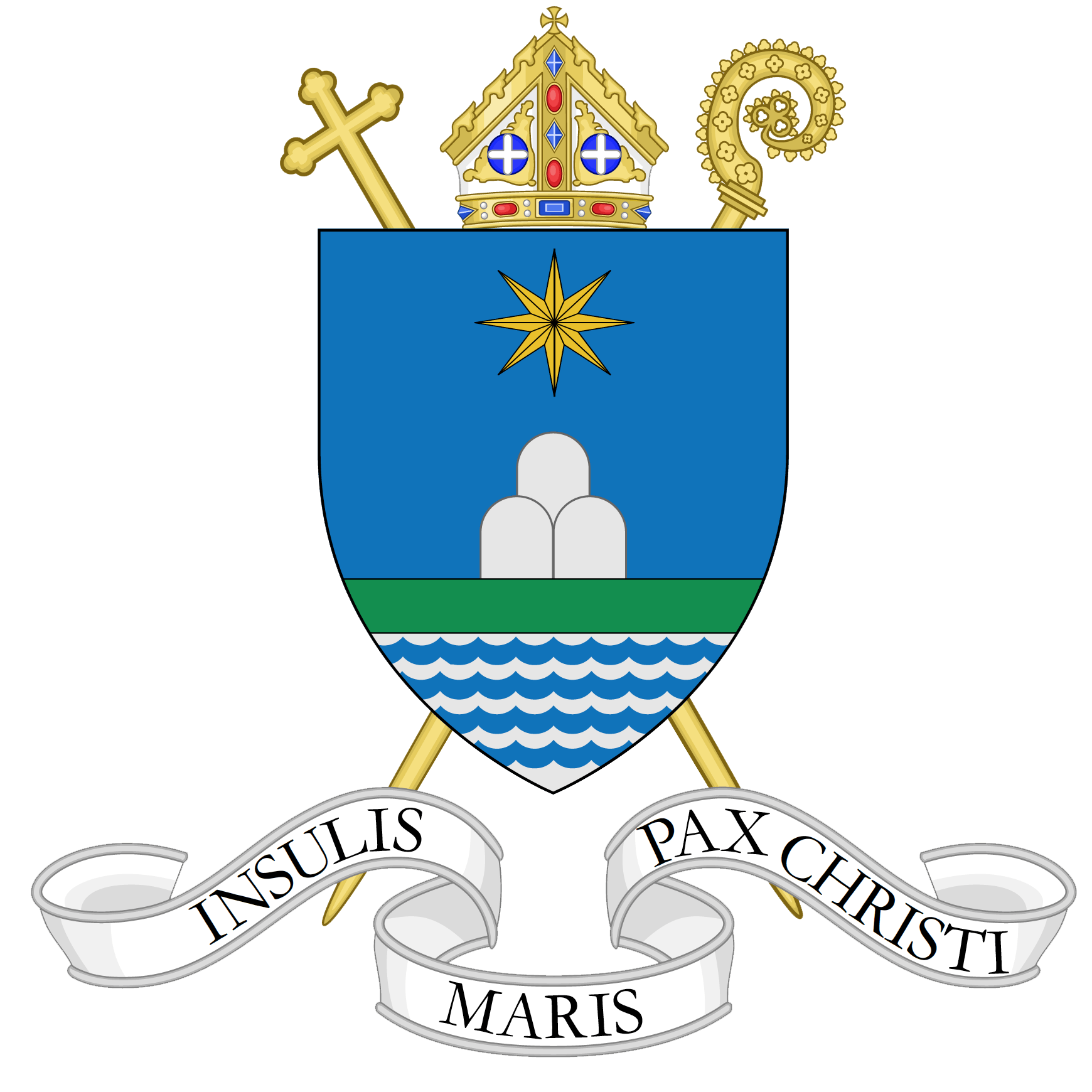 The coat of arms of the Prefecture are largely based on those of Pope Pius XII, during whose pontificate the Prefecture was erected. They feature a trimount argent – a mountain with three peaks in silver – on a green field, representing land, and the waves representing the ocean. Above the trimount is an eight-pointed star in gold, which represents the Virgin Mary, who is patroness of the Prefecture under her title ‘Star of the Sea’.